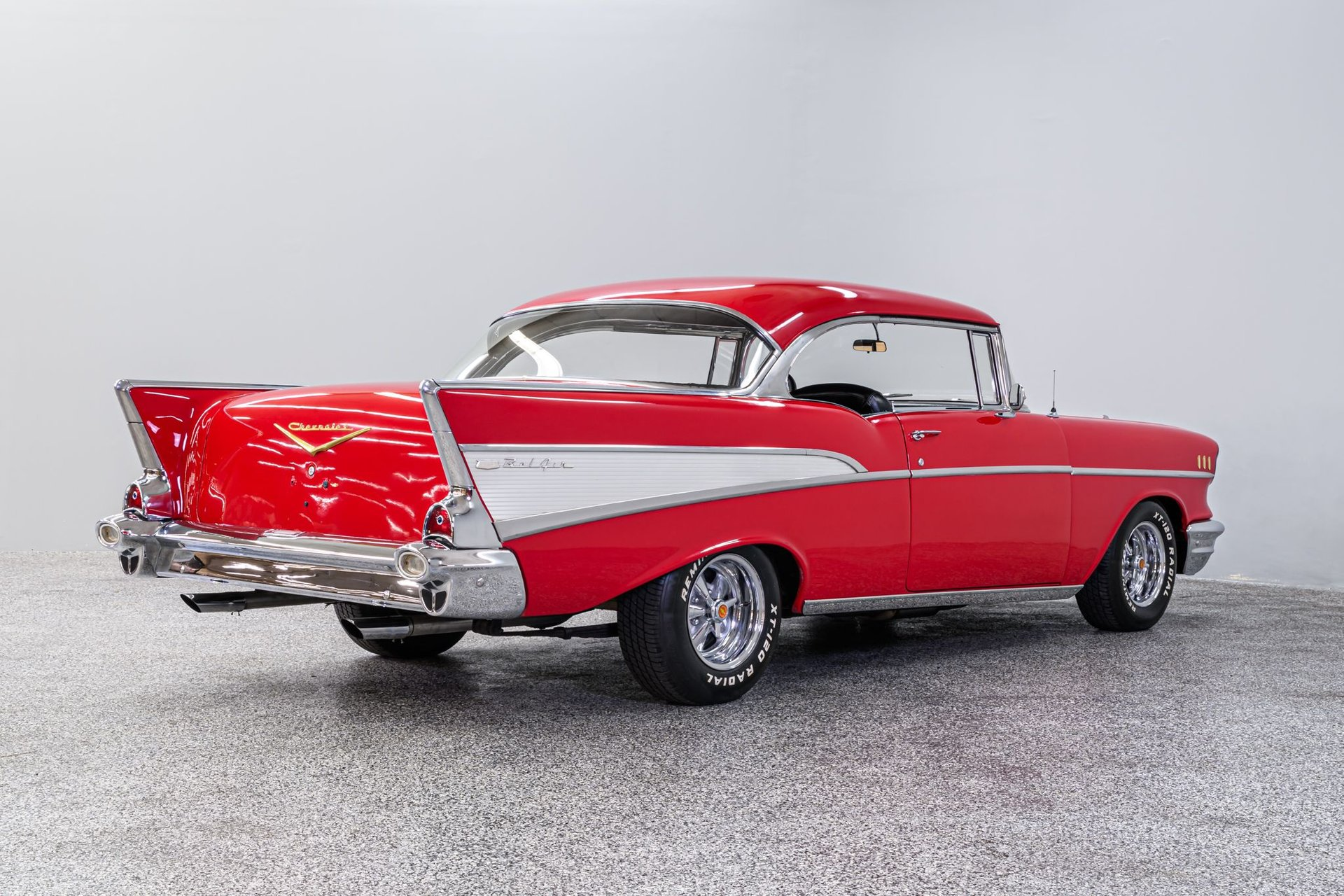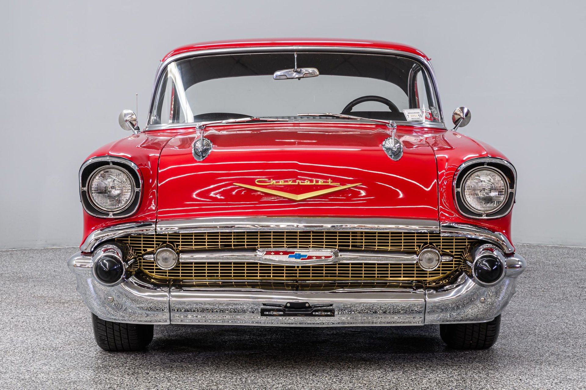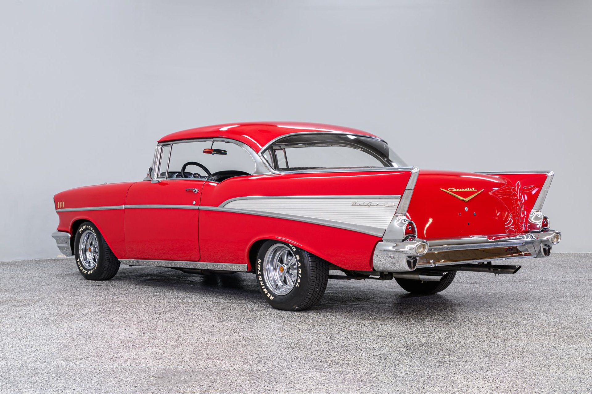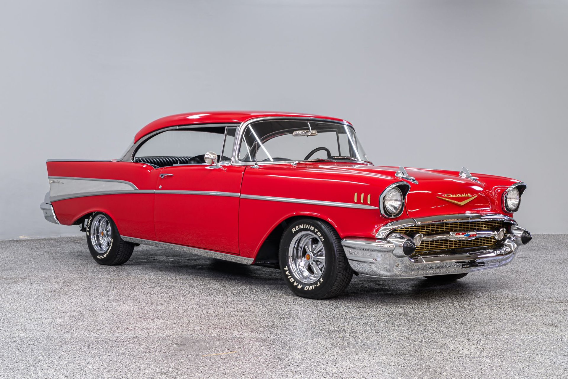 There is a book titled 'All Corvettes are Red'. Maybe the same standard applies to the '57 BelAir, or should. It is an accepted fact that the lines of the classic '57 BelAir are virtually perfect and the artist of this Chevrolet knew exactly how to paint the canvas in order to create a beautiful restoration. The stunning Red finish is exemplary, the chrome flawless and the interior stunning. This BelAir sits just right on a set of period-correct Cragar-style wheels and Remington radials. Inside, the black vinyl rolled/pleated interior is impressive. A front bucket seat configuration looks like the factory design and upholstery work is near faultless. The original steering wheel has been replaced with a leather-wrapped wheel and a full set of custom analogue gauges are mounted in the classic factory dash. Enjoy the ride with cold Sanden A/C, tinted windows, tilt wheel and AM/FM stereo. Under the hood is a built 327ci small-block fitted with an Edelbrock 'E-Street' EFI fuel injection system, street cam, tube headers and aluminum radiator w/electric fans. It is backed by a 4-speed Muncie w/Hurst Comp+ shifter and positraction differential with 3.90:1 gearing. The chassis incorporates power rack/pinion steering, power disc/drum brakes, dual master cylinder and a custom exhaust. This is an extraordinary '57 BelAir - any one of us would be proud to be the next owner of this machine.