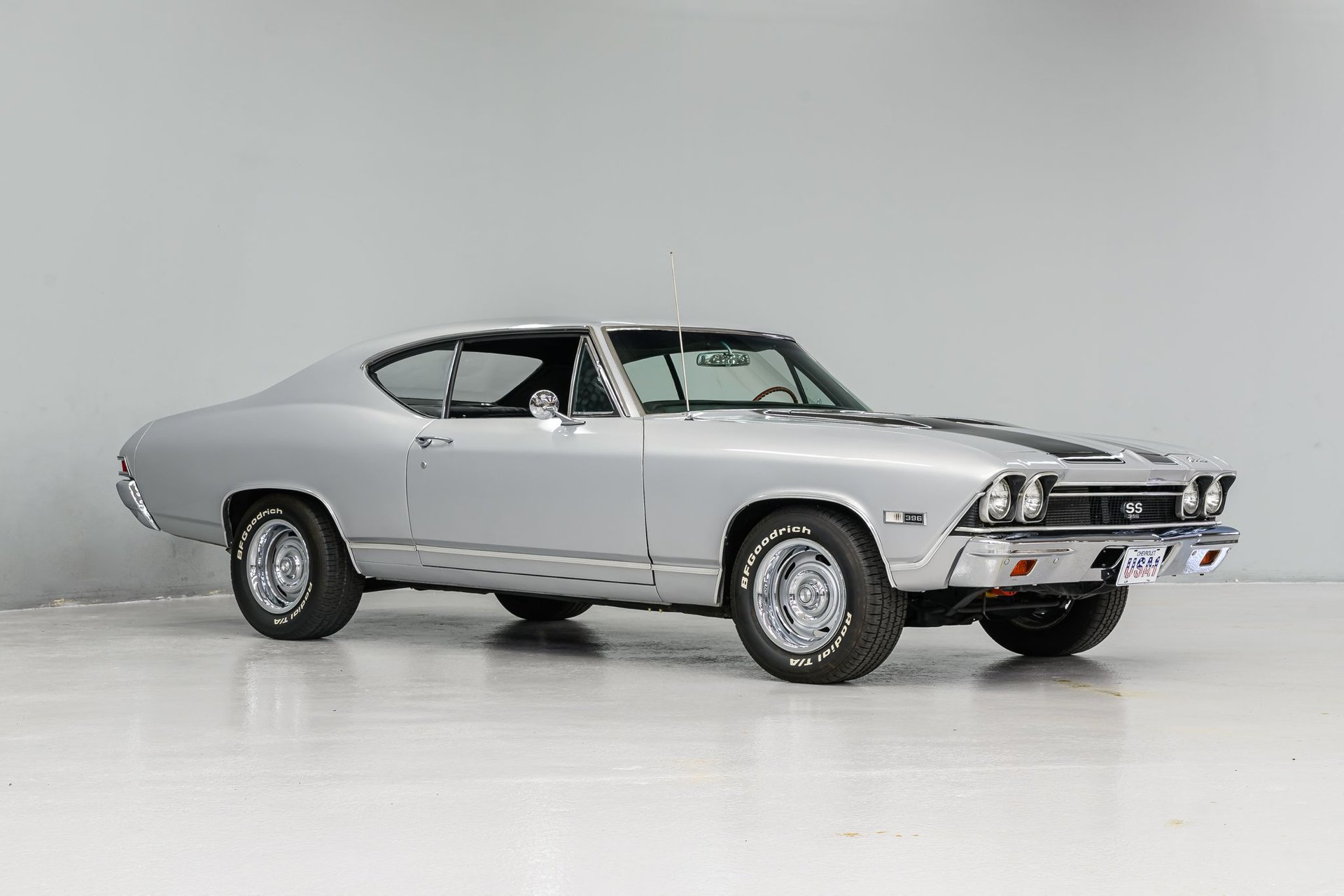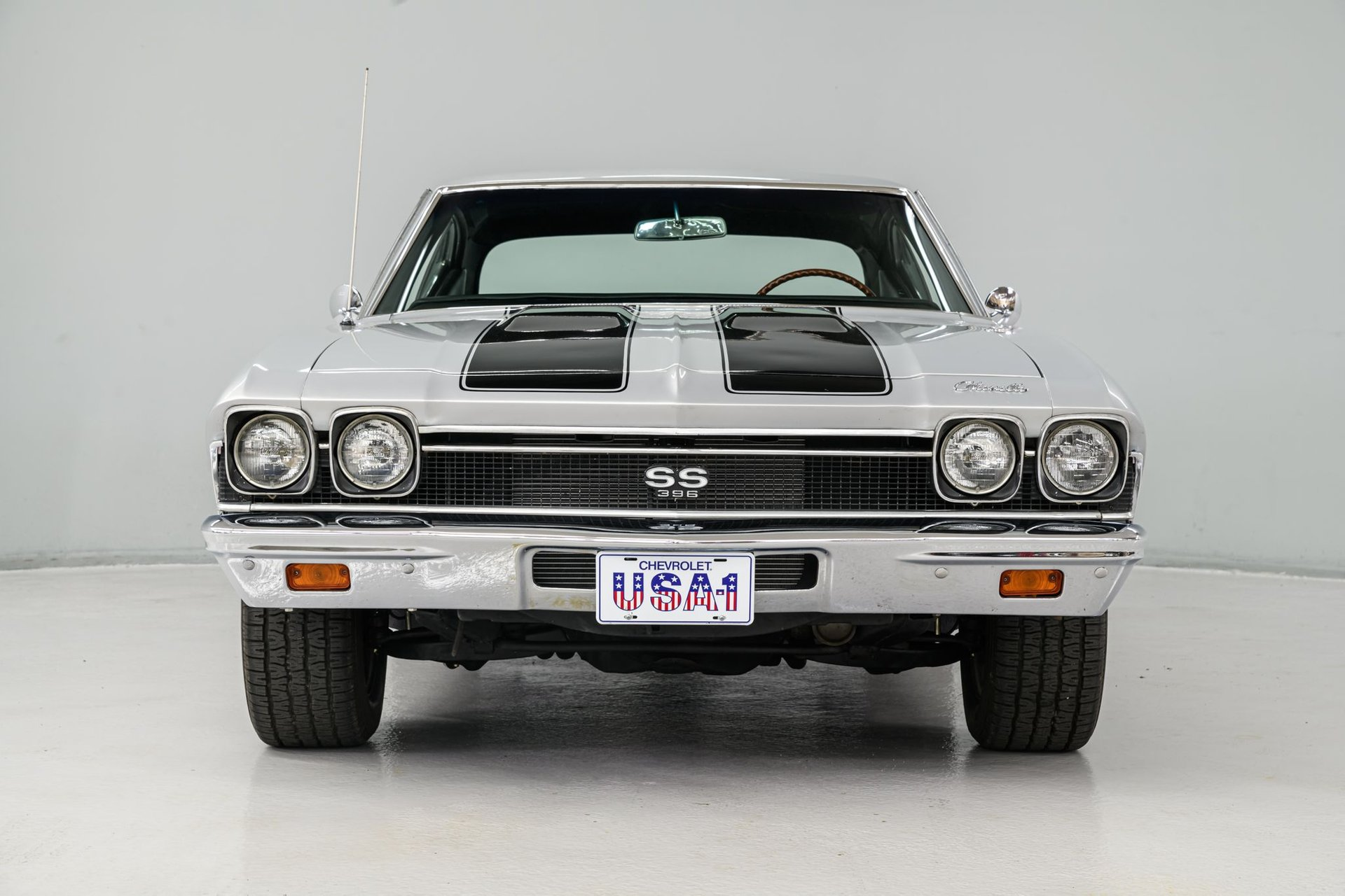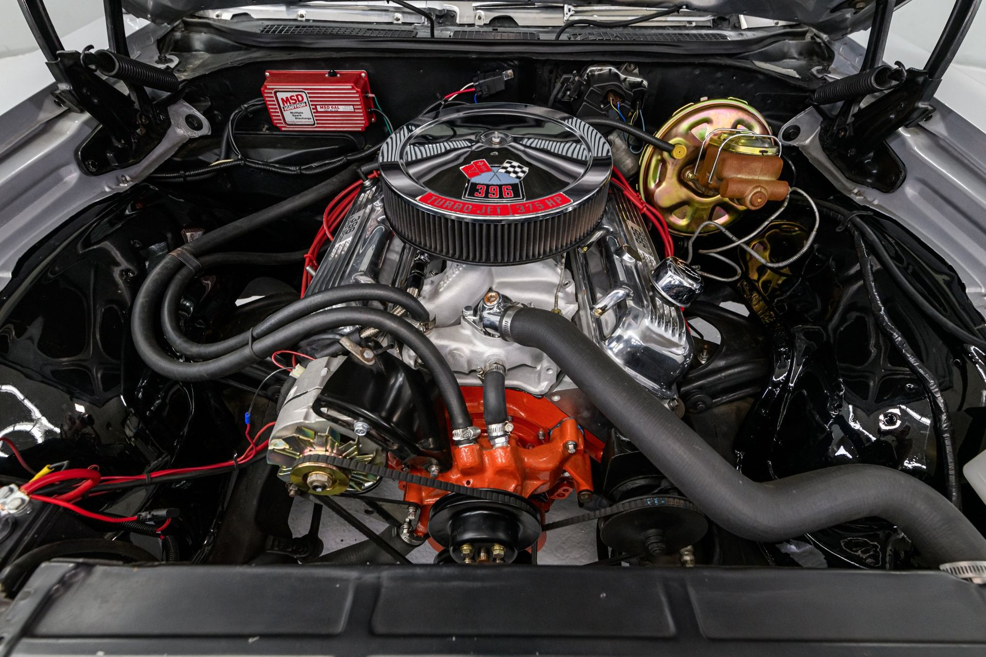 This 1968 Chevelle Malibu hardtop is very impressive. It was a 136…. code from the factory, but has benefited from an outstanding frame-off restoration (2012) that honors the legendary Chevelle SS396. The exterior received a professional two-stage Silver respray that is accented with the SS396 hood/stripes, SS396 grille/rear fascia/logos and excellent chrome/stainless. The stance is pure muscle car on 15”x8” SS rally wheels and new BFGoodrich Radial T/A tires. It's black vinyl interior has been carefully restored and features bucket seats, 3-spoke GM 'wood' wheel, JVC AM/FM/CD sound system, Hurst Comp+ shifter, tinted glass, an after-market gauge cluster and Sunpro Super tach.