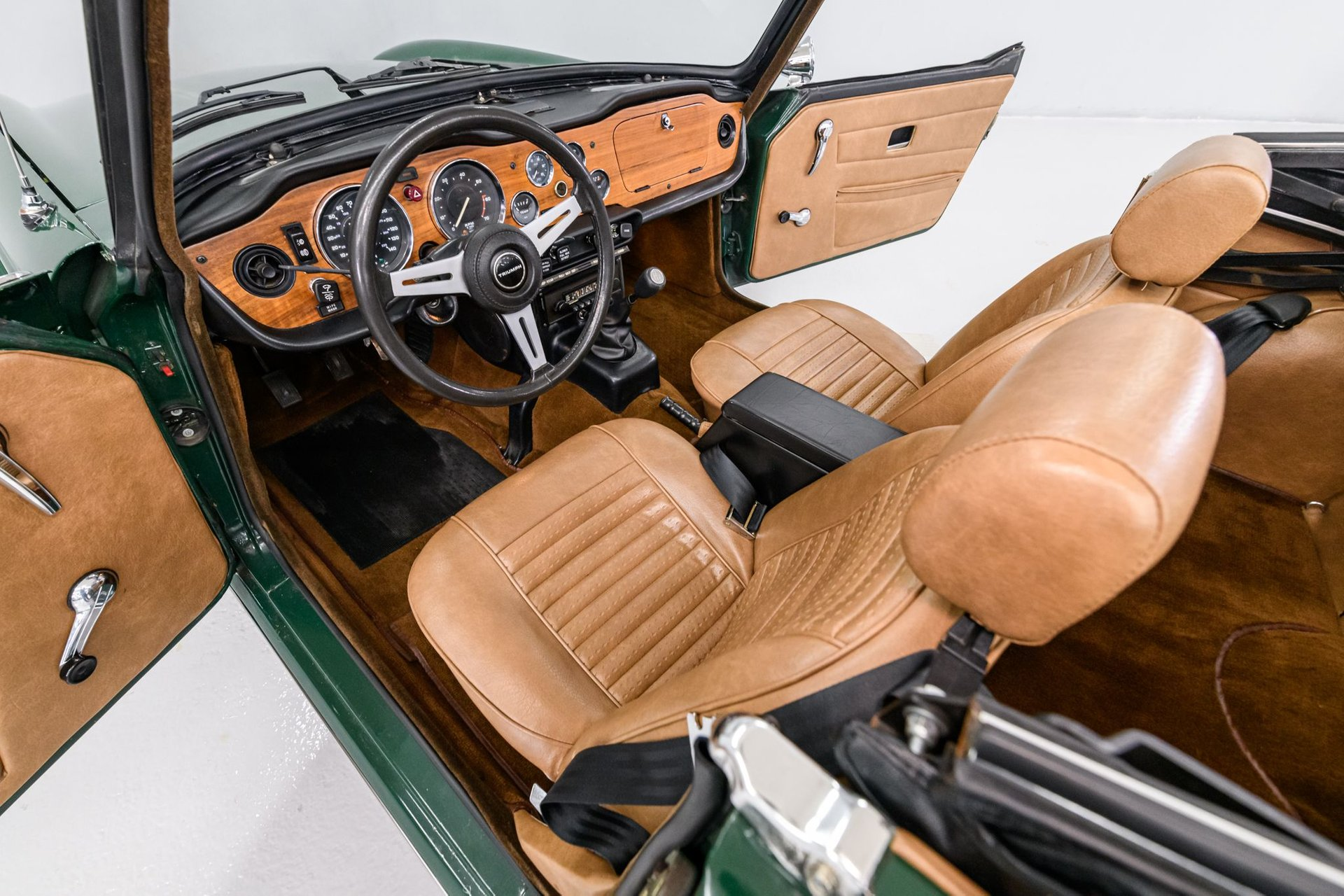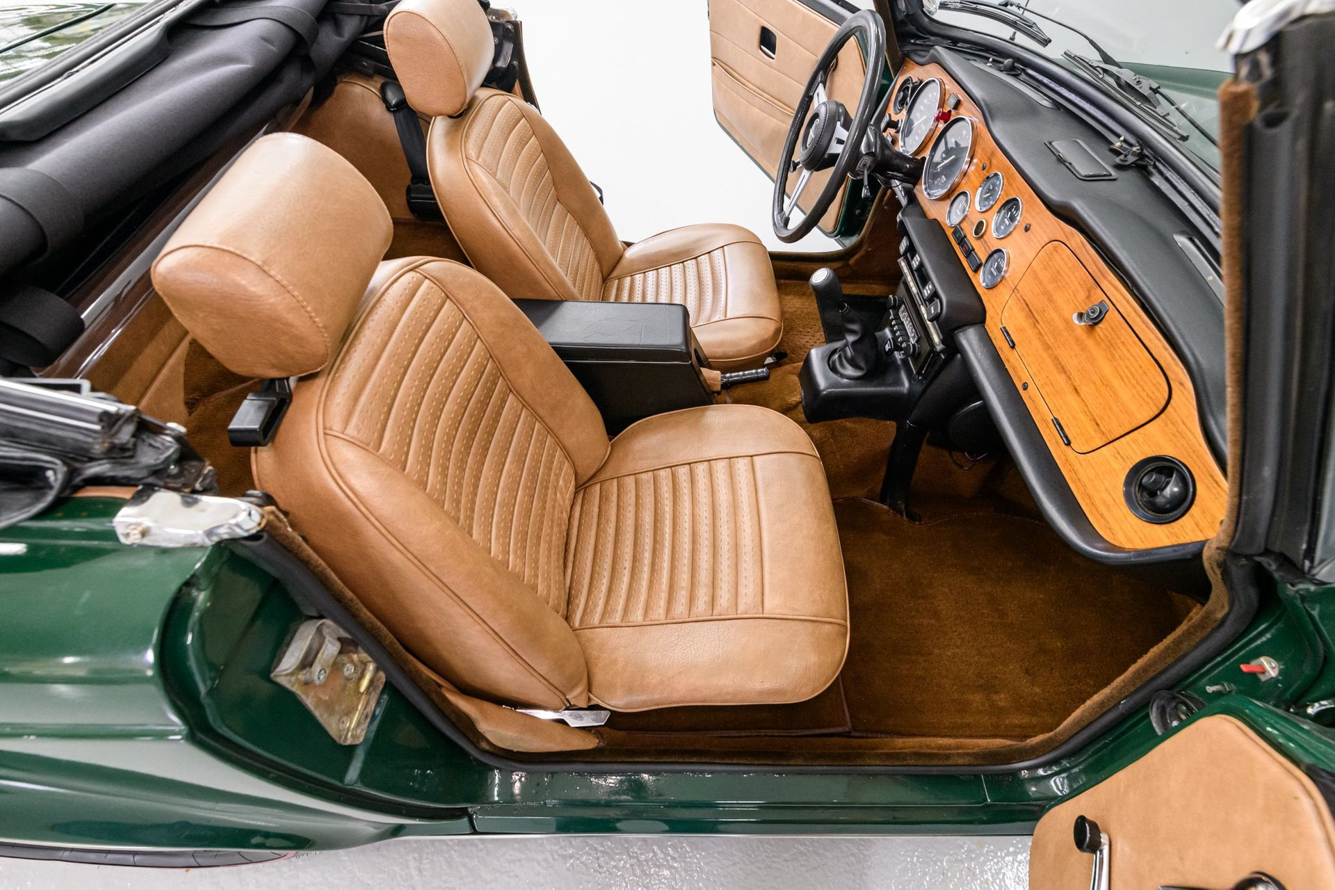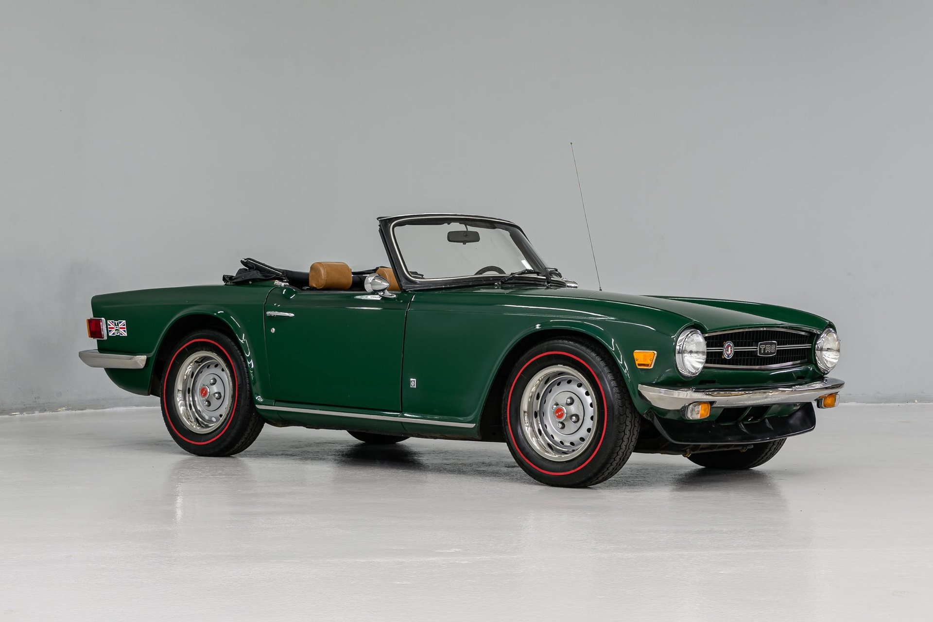 The Triumph TR6 was a very successful roadster - it is regarded by most to be the best TR series. During its 8-year model run (1968-1976) over 94,000 Triumph TR6s were built and exported around the world. This 1975 TR6 has had a full restoration and the Owner has provided a complete binder of documentation on the car. A 'Certified Copy of the Factory Record' from BMIHT, Great Britain is also furnished. The professional respray of British Racing Green is in fair condition and new stainless bumpers are a nice accent. The tan leather interior has been restored to near original condition and features include a new classic walnut veneer dash w/full instrumentation, new dash pad and vintage Blaupunkt AM/FM sound system. The newly installed convertible top is also excellent and a tan tonneau is provided.