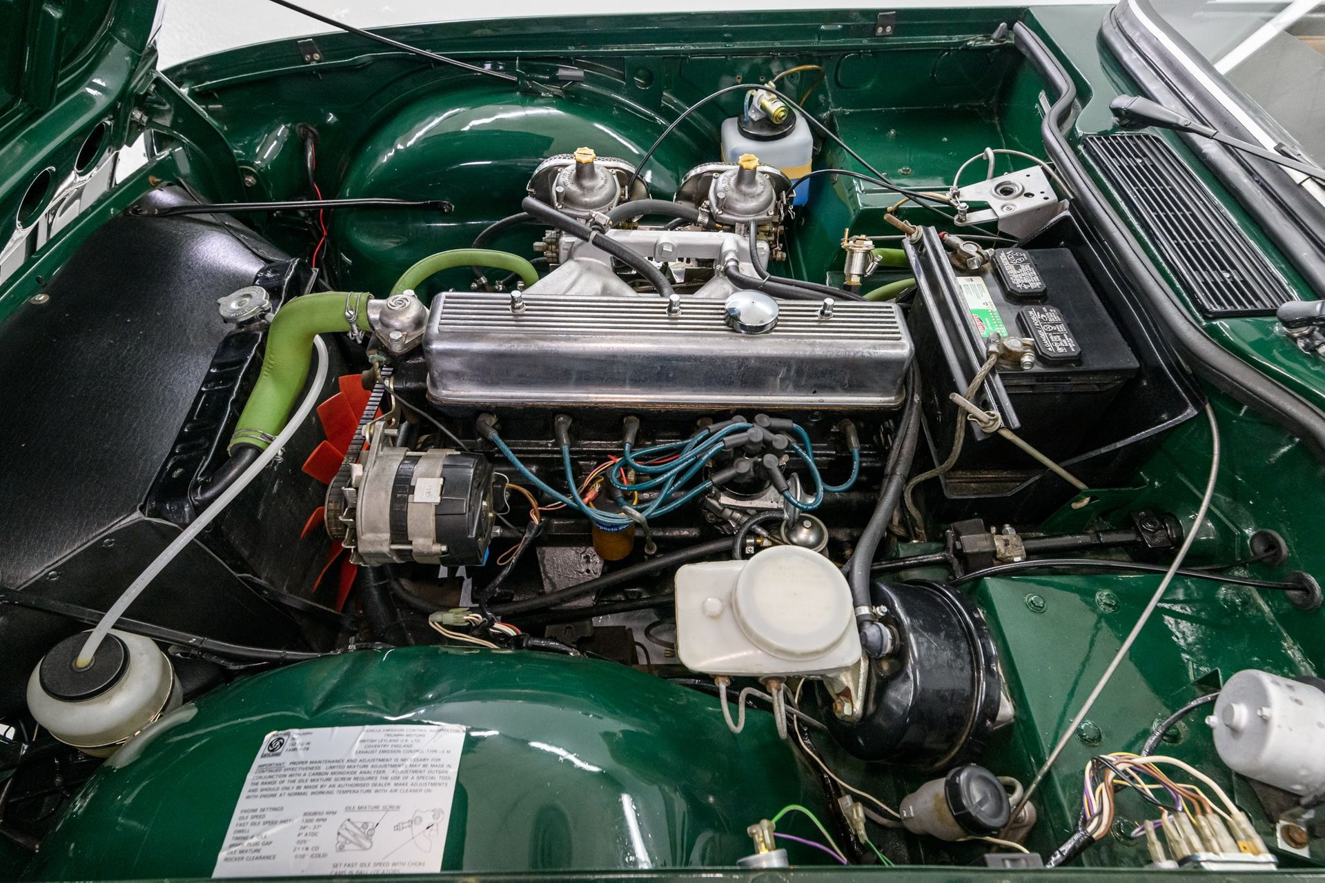 The TR6 is powered by Triumph's 2.5-liter/104bhp OHV straight-6 that sits in a spotless engine compartment. US versions were delivered with dual Zenith Stromberg '175' carburetors. The Owner states that it is the original matching numbers engine and has never required a rebuild (140-146 psi in all cylinders). A new upgraded distributor and Pertronix ignition system has been installed along with a new alternator and fuel pump. The stainless exhaust system provides a wonderful Triumph growl. The powerplant is backed by a fully-synchronized 4-speed overdrive manual gearbox w/new clutch. Traditional body-on-frame construction features rack-and-pinion steering and semi-trailing arm independent rear suspension. Factory steel wheels (w/trim rings/centers) sport new 15” Vredestein performance radials. Brakes are front disc/rear drum and most suspension/brake components have been replaced. Much, much more has been done to this Triumph and has been documented in the Owner's binder. This British icon is waiting to meet its new owner. That will not take long - it is a classic TR6.
