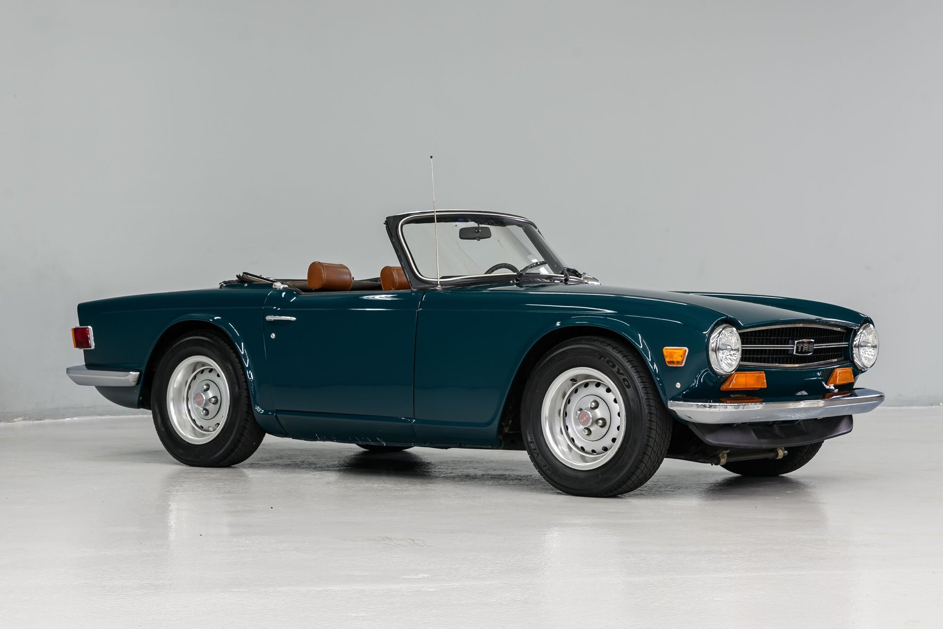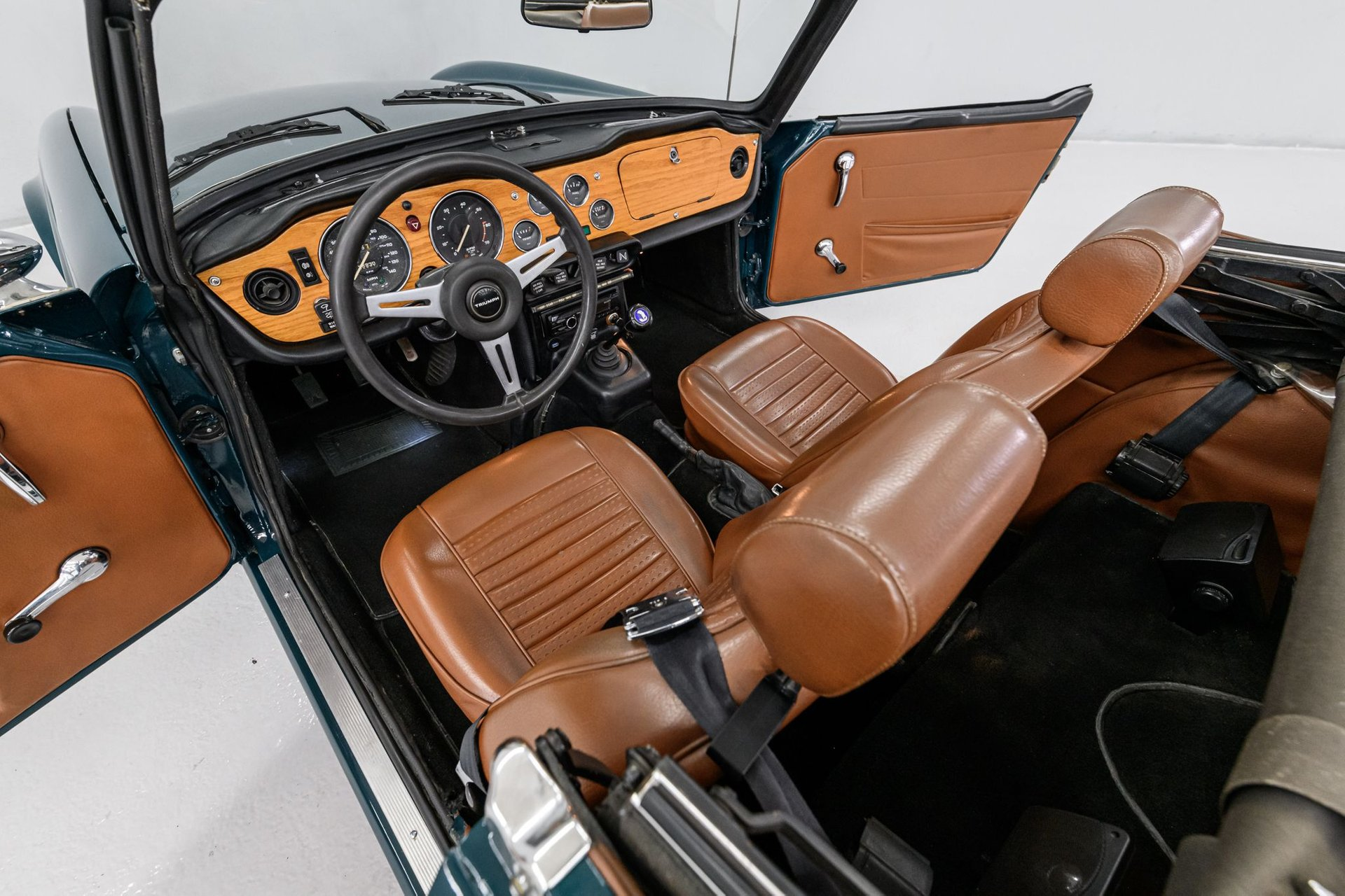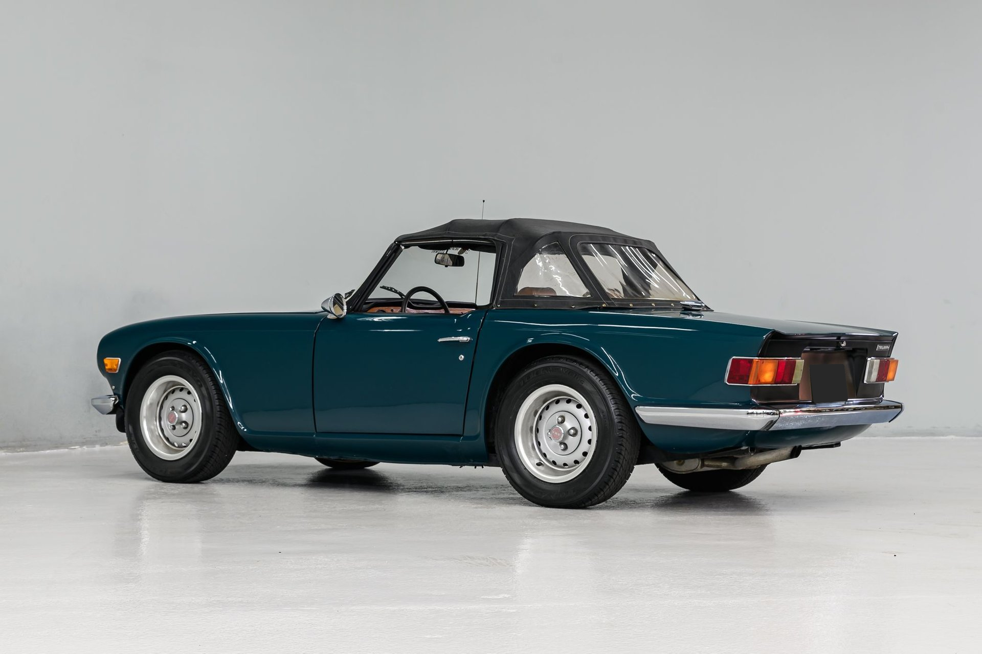 The Triumph TR6 is arguably the most popular and best-built Triumph sports car of all-time. Triumph manufactured over 94,000 of the TR6 model and shipped them world-wide. This '73 TR6 has been carefully restored to virtually original condition. The car received a professional respray that is a shade different than the original British Racing Green. It is in very good condition and chrome/stainless are excellent. Factory 'road' wheels w/centers & trim rings mount 15” Toyo radials. The convertible top and frame are in good condition with only some minor canvas blemishes. The interior has been restored and appears very much like it did in 1973. Its tan leather upholstery is also in very, very good condition and the walnut veneer dash is fitted with full factory instrumentation and an aftermarket Sony AM/FM/CD sound system. All TR6s were powered by Triumph's 2.5-liter in-line six. US versions were delivered with dual Zenith Stromberg '175' carburetors. We do not have a full history on this engine so we do not know if it has been rebuilt, but it sounds great. The engine is backed by a four-speed fully-synchronized manual gearbox and cooling is managed by an aluminum radiator. The chassis is equipped with rack-and-pinion steering, power slotted-disc/drum brakes and independent semi-trailing-arm rear suspension. This is a solid, classic TR6 that is a good investment and fun to drive.