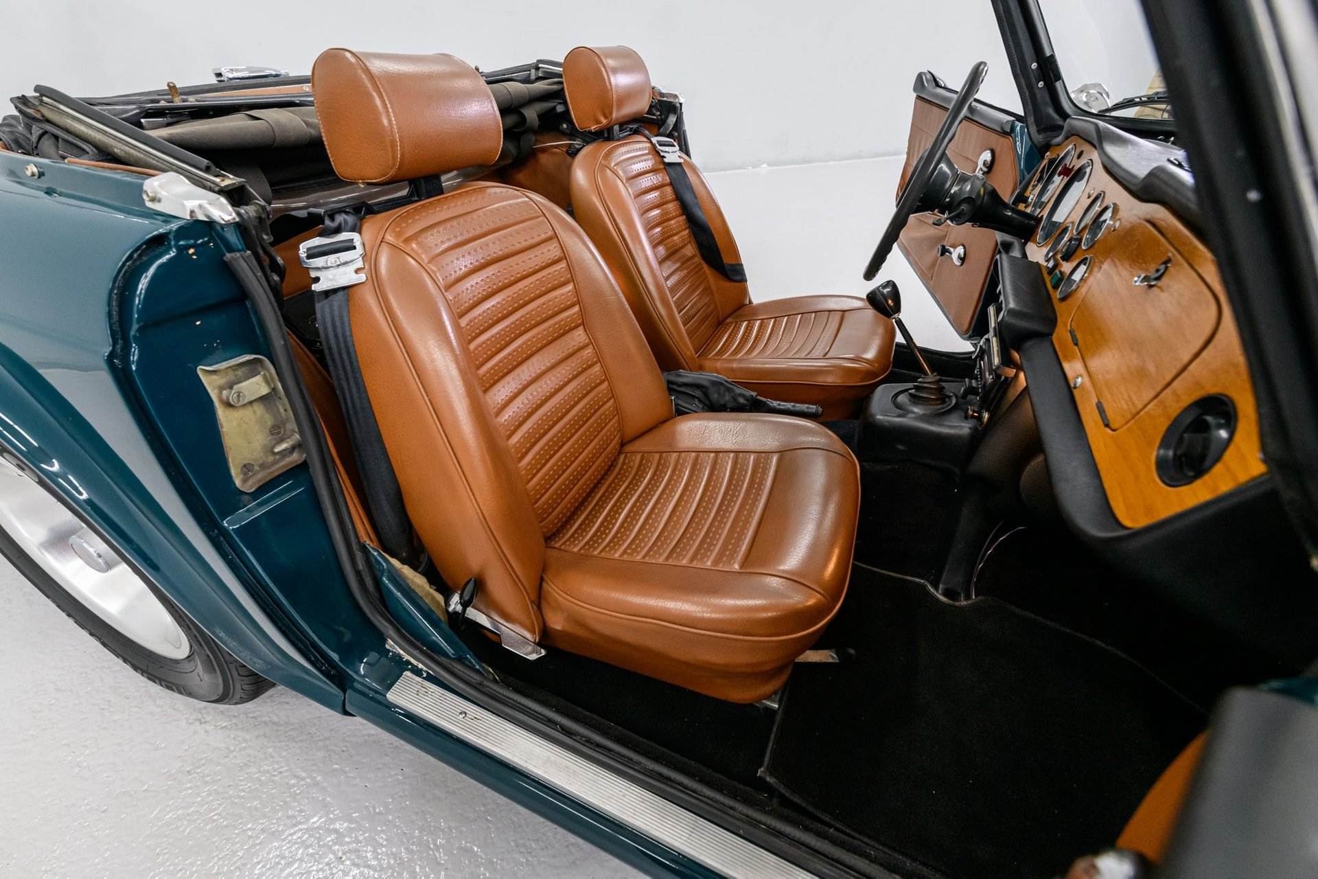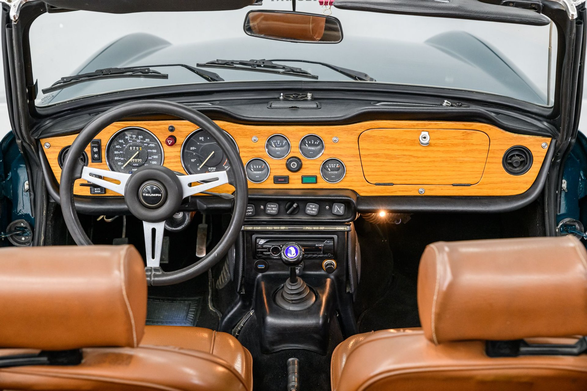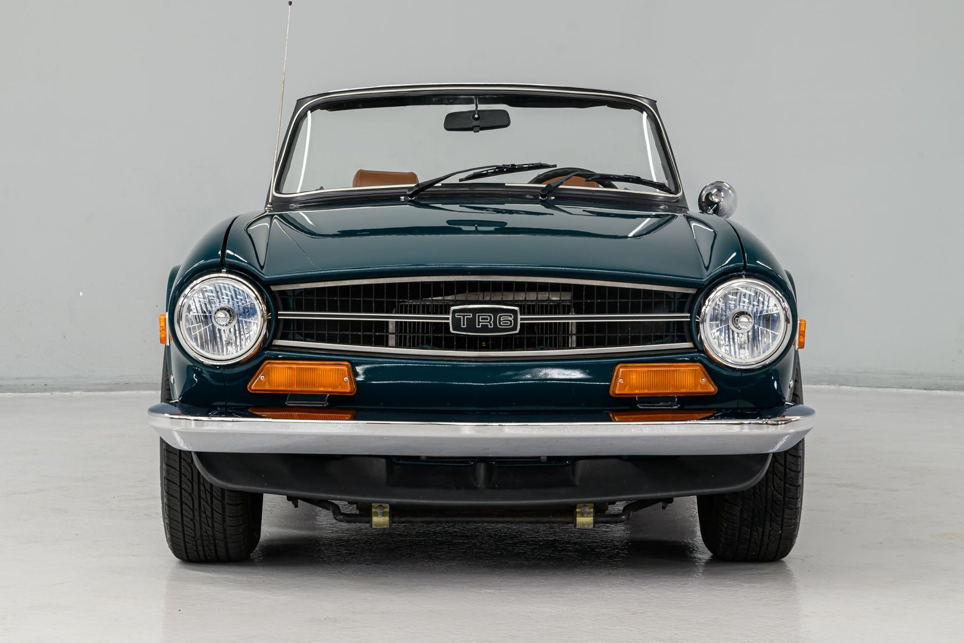 The Triumph TR6 is arguably the most popular and best-built Triumph sports car of all-time. Triumph manufactured over 94,000 of the TR6 model and shipped them world-wide. This '73 TR6 has been carefully restored to virtually original condition. The car received a professional respray that is a shade different than the original British Racing Green. It is in very good condition and chrome/stainless are excellent. Factory 'road' wheels w/centers & trim rings mount 15” Toyo radials. The convertible top and frame are in good condition with only some minor canvas blemishes. The interior has been restored and appears very much like it did in 1973. Its tan leather upholstery is also in very, very good condition and the walnut veneer dash is fitted with full factory instrumentation and an aftermarket Sony AM/FM/CD sound system. All TR6s were powered by Triumph's 2.5-liter in-line six. US versions were delivered with dual Zenith Stromberg '175' carburetors. We do not have a full history on this engine so we do not know if it has been rebuilt, but it sounds great. The engine is backed by a four-speed fully-synchronized manual gearbox and cooling is managed by an aluminum radiator. The chassis is equipped with rack-and-pinion steering, power slotted-disc/drum brakes and independent semi-trailing-arm rear suspension. This is a solid, classic TR6 that is a good investment and fun to drive.