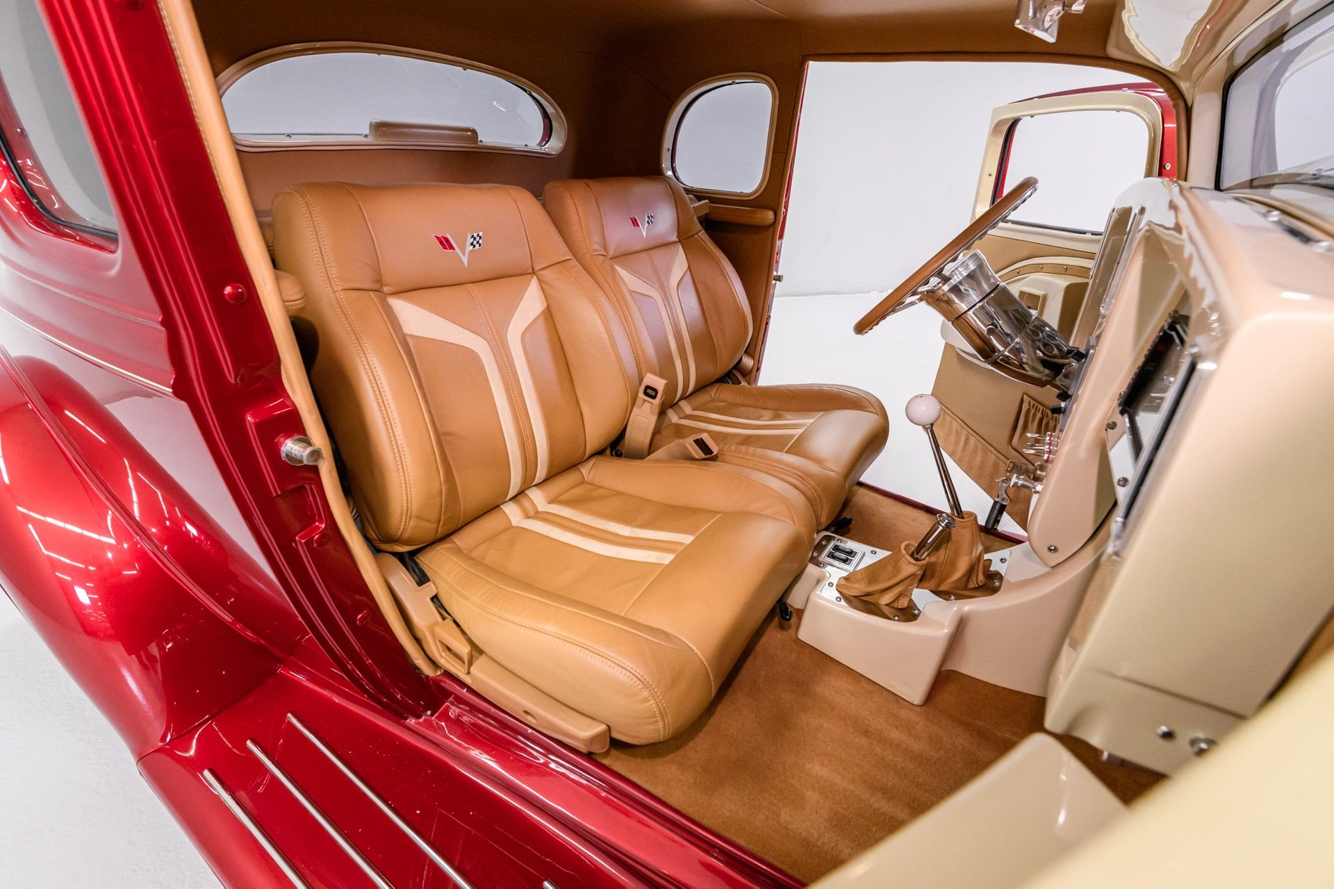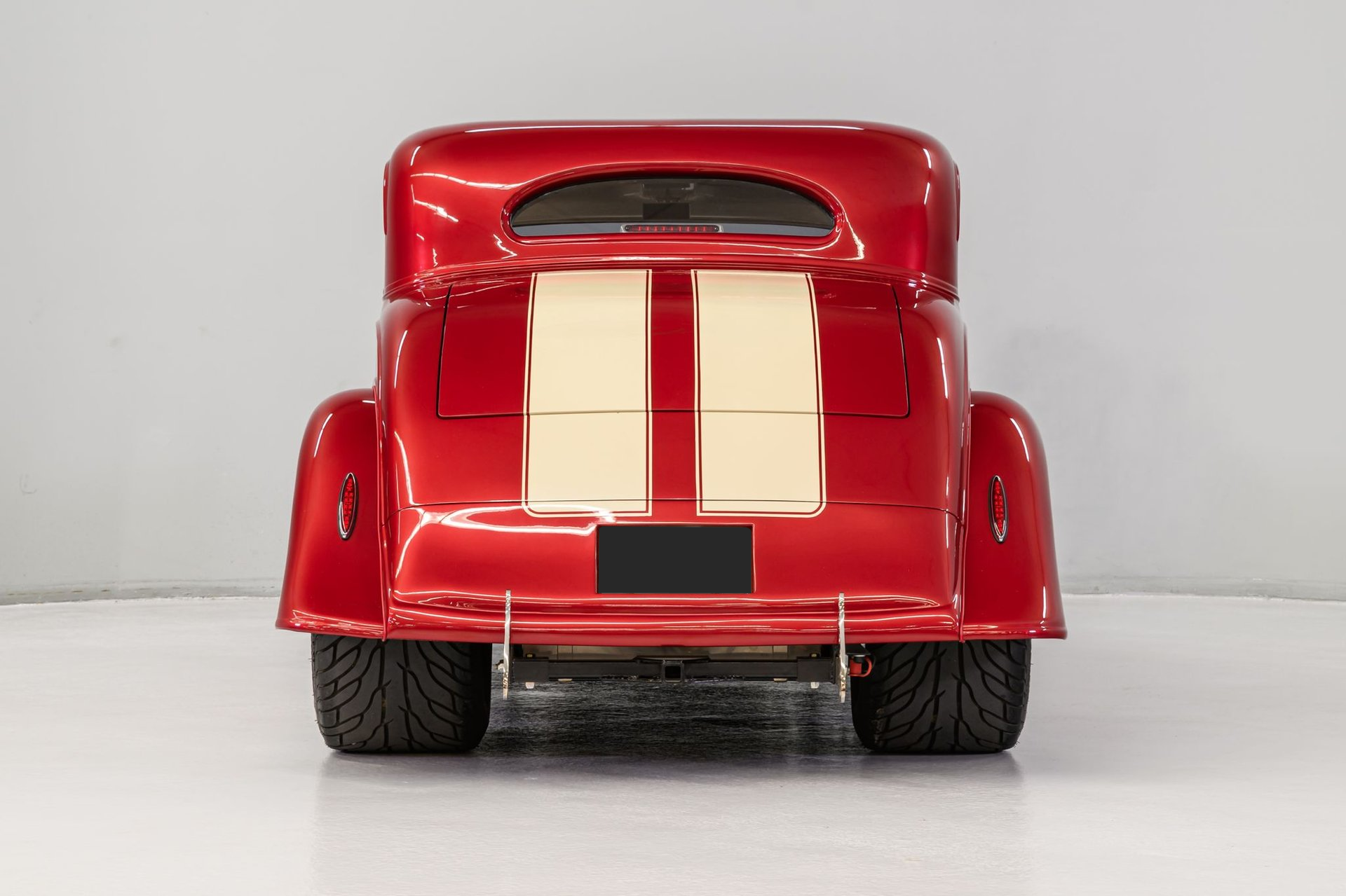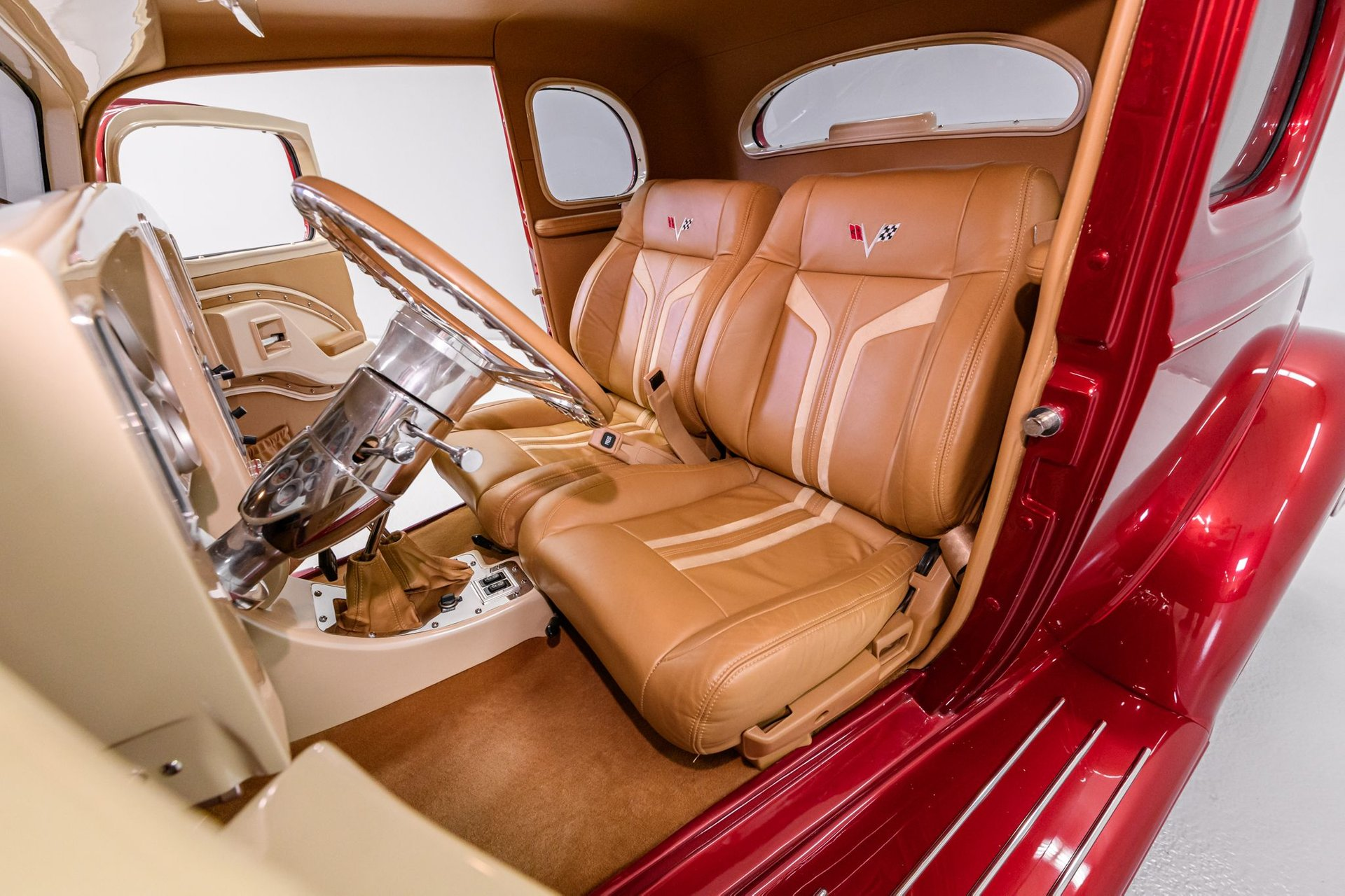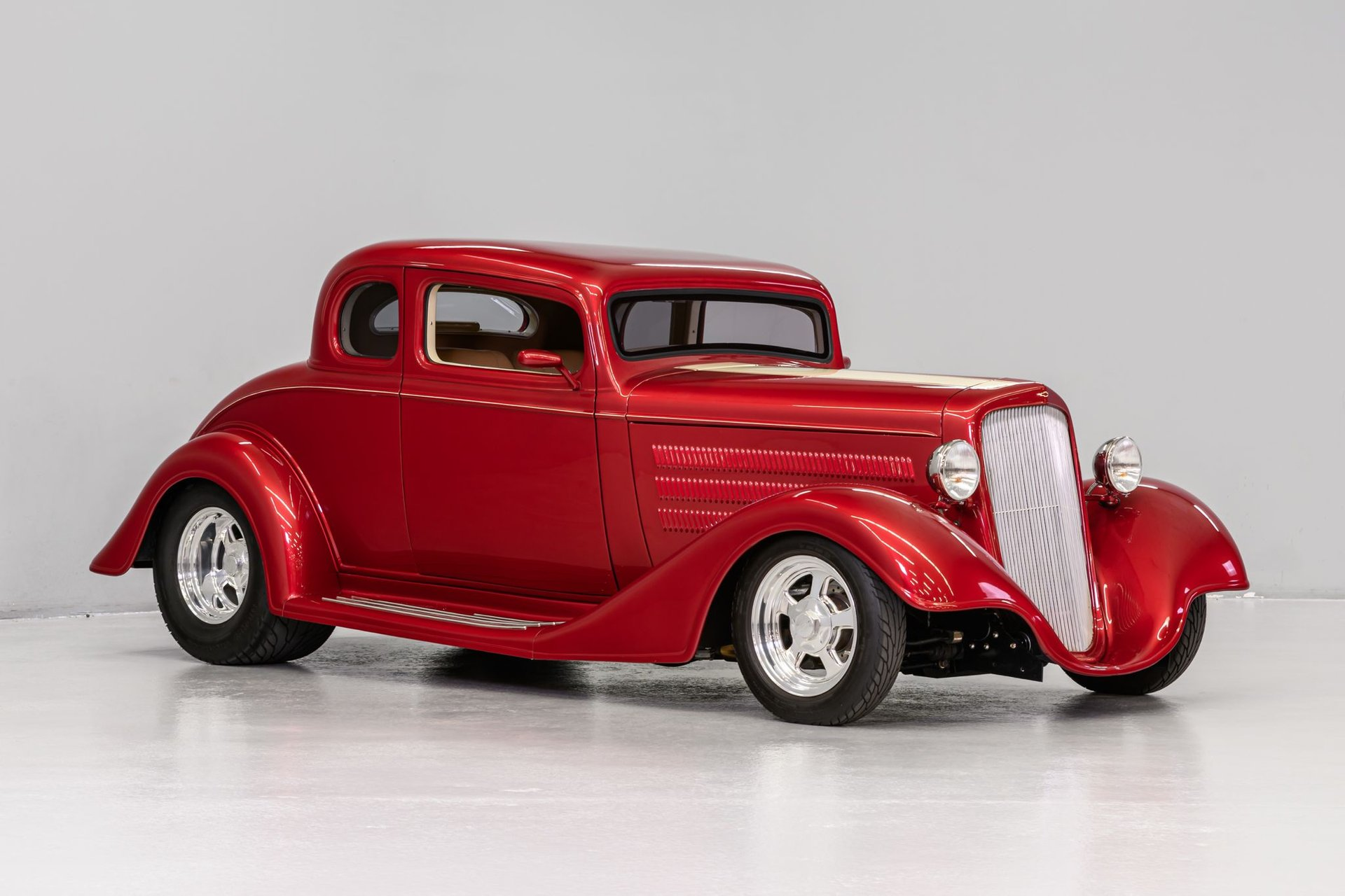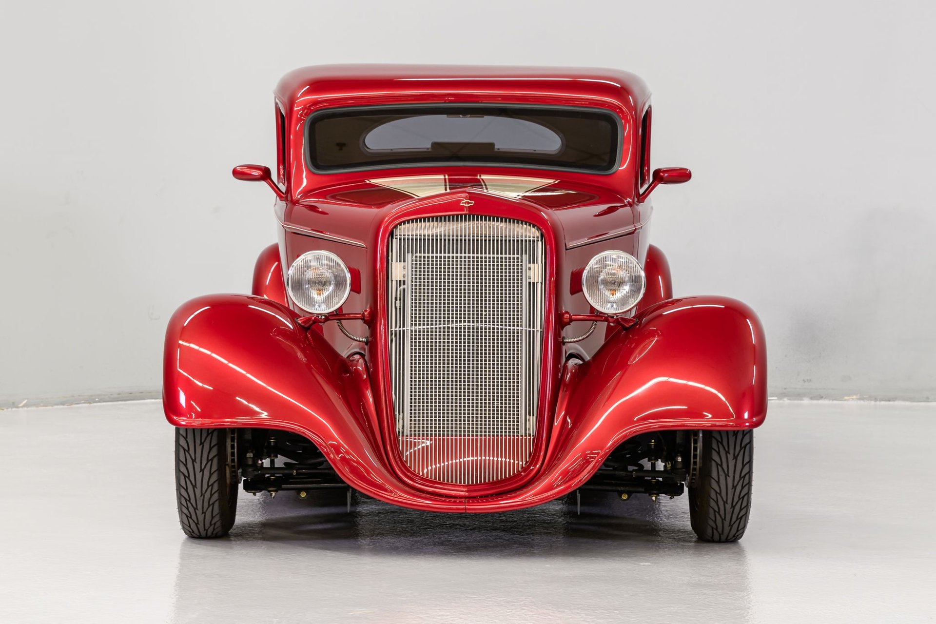 Look at the photos of this 1933 Chevy Street Rod - the attention to detail is unbelievable. From the beautiful paint, to the stunning interior, to the powerful drivetrain, this Chevy is an example of how to design and build a top-shelf street rod. This coupe was finished in 2016, but looks like it was built yesterday. The 2.5” chopped fiberglass '33 body w/'34 fenders received a virtually flawless coat of Ferrari Rosso Red with trademark Chevy strips. A Dan Fink Metalworks 3-piece double-opening hinge kit operates the steel Rootlieb hood w/side louvers. The menacing stance is accented by Billet Specialties 'Vintique' alloys that mount Mickey Thompson Sportsman radials front and rear (29/15R15). The stunning interior features Nissan bucket seats upholstered in beige leather. Other highlights include full console, power tinted windows, keyless entry and a Pioneer AM/FM/CD/DVD sound system with MP3 and GPS Navigation. (The Chevy is also fitted for A/C, but the owner states that there is a small freon leak in the system so it is currently inop.) A custom dash sports a full set of Autometer gauges and a 'spoke' wheel rests on a tilt column. The rear storage compartment is finished as carefully as the interior and all electrics are managed by a 23-circuit American Autowire package. Under the hood is a GM LS1 346ci small-block that sounds perfect through stainless headers and exhaust. It is fitted with LS-6 heads, Isky Performance cam, Speartech engine management system, aluminum radiator and custom fiberglass air intake/engine cover. Our LS1 dynoed at 451bhp and is backed by a Tremec T56 Magnum 6-speed manual gearbox with hydraulic clutch. Torque is transferred via an aluminum driveshaft to a narrowed 9” Ford differential with Detroit/Eaton Truetrac positraction and 3.70:1 gears. The spotless custom chassis is equipped with a Mustang II front end, rack and pinion power steering and front sway bar. The rear suspension is parallel 4-link w/coil over shocks, panhard bar and sway bar. Brakes are power assisted 4-wheel disc and the 17 gallon fuel tank is stainless steel. Nerf bars and a hitch receiver have been added arrears. Look at the photos again. Take the time to come to the Autobarn and see this Chevy - you will not be disappointed.