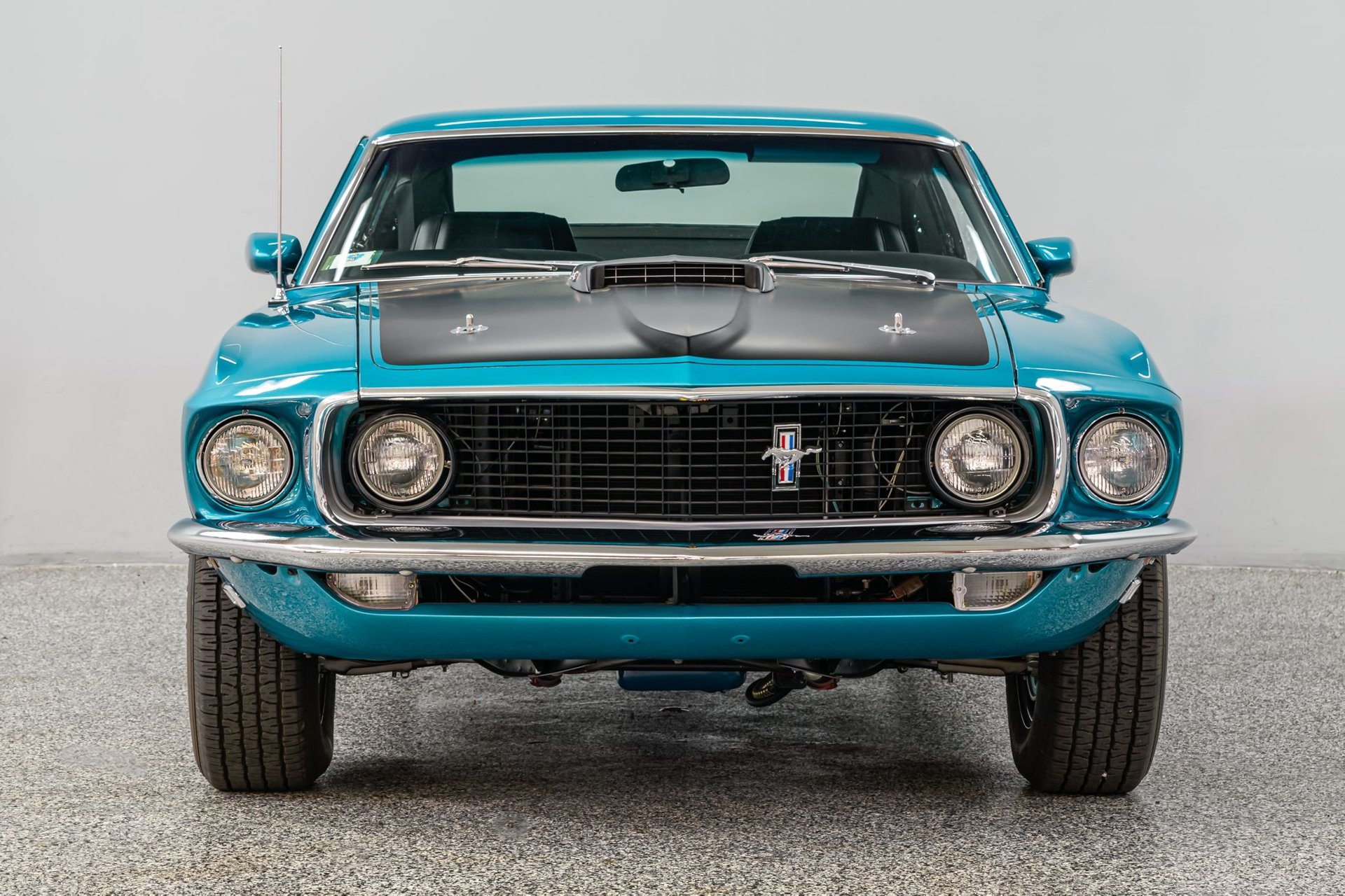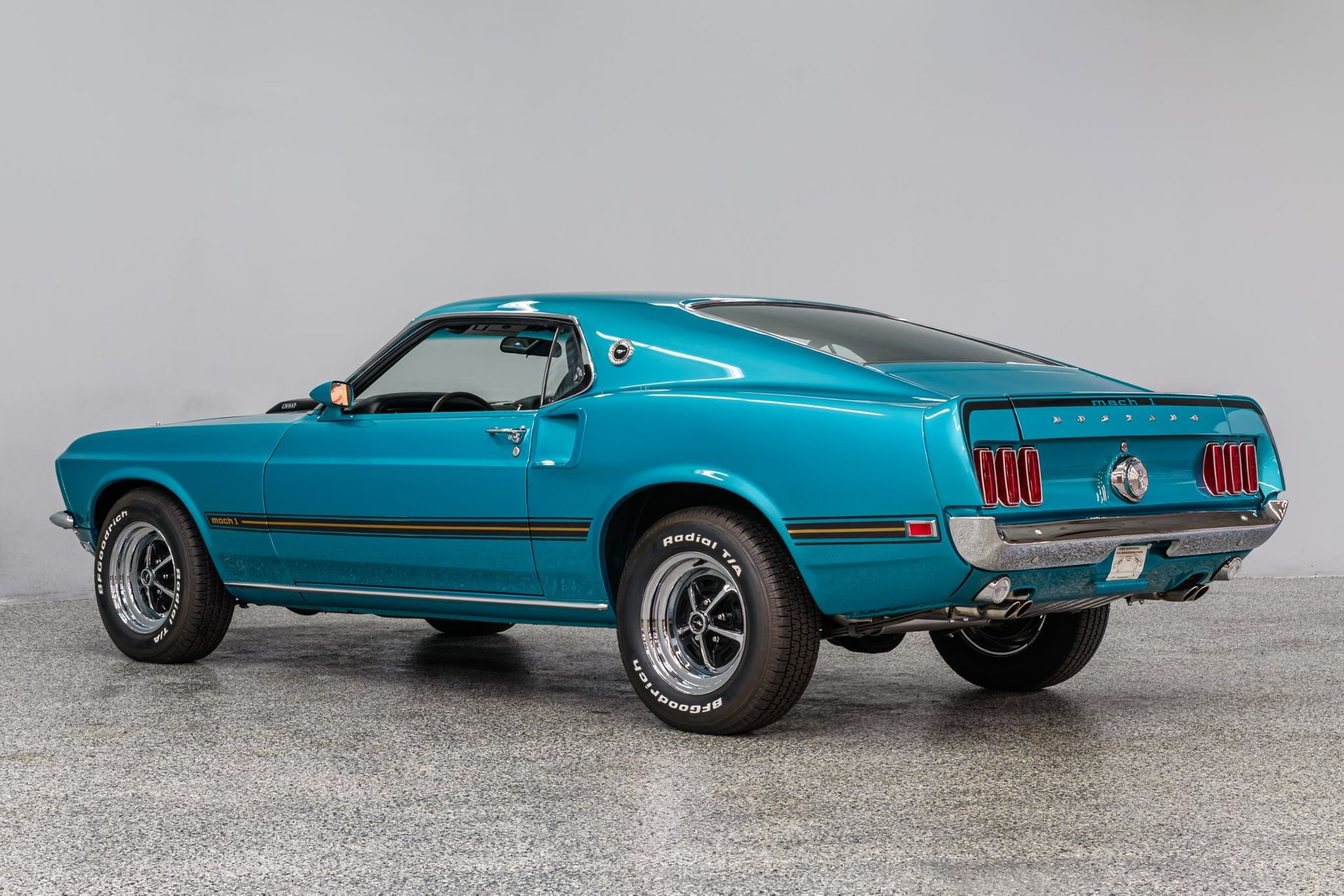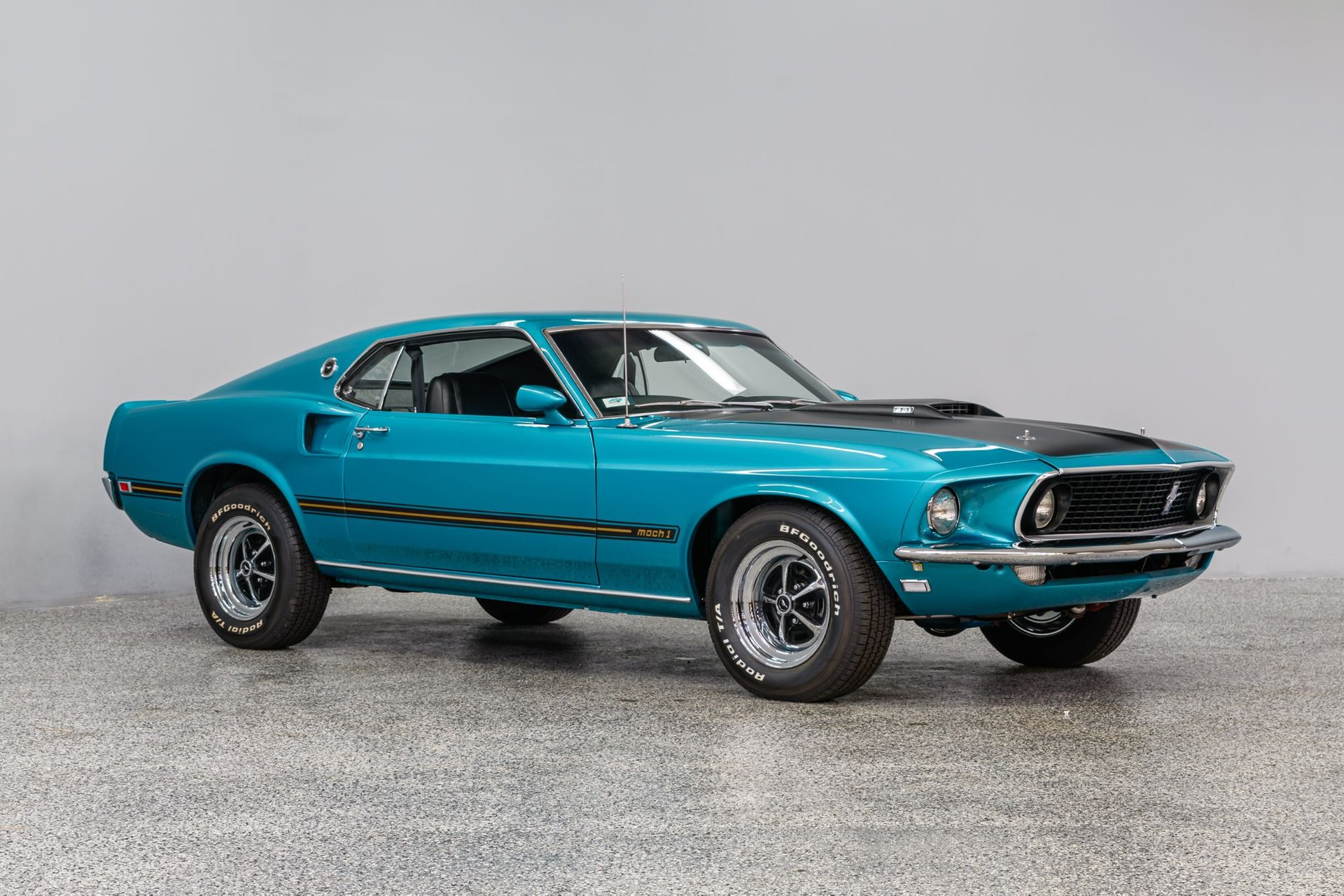 Automotive craftsmen hope to conceive a classic with every new clay model. In 1969, the designers of the Mustang Mach I created one of those enduring designs, a design that years later many say was the foundation for the 5th/6th generations of the Mustang. The original 1969 Mach I model utilized Mustang's new 'Sportsroof' body and added numerous visual and performance enhancing items such as a black hood treatment with hood scoop/pins, HD suspension, chrome pop-open gas cap, spoilers and chrome exhaust tips. This stunning '69 Mach I retains all of these features plus a superb restoration to better-than-original. The two-stage Gulfstream Aqua finish (F5 code - original color) re-spray is virtually perfect and Mach I side strips and blacked out hood treatment add stunning accents. A fully restored interior features black knit vinyl Hi-Back bucket seats w/red trim, new Sanden A/C, tinted windows, full gauge cluster and premium RetroSound Hermosa AM/FM/Bluetooth 4-channel sound system. The 351/4V Windsor, said to be matching numbers, has been carefully rebuilt to stock specs and is backed by a 4-speed manual gearbox w/Hurst Comp+ shifter. A 9” Ford Traction-Lok differential is fitted with 3.25:1 gears. The suspension is tight and handling is managed by power steering, power disc/drum brakes w/dual master and 'Magnum 500' 15” polished wheels with BFGoodrich Radial T/A treads. This classic Mach I is a piece of Blue Oval history from a time when muscle cars ruled the streets. It is nicer than new and an investment that will not disappoint.