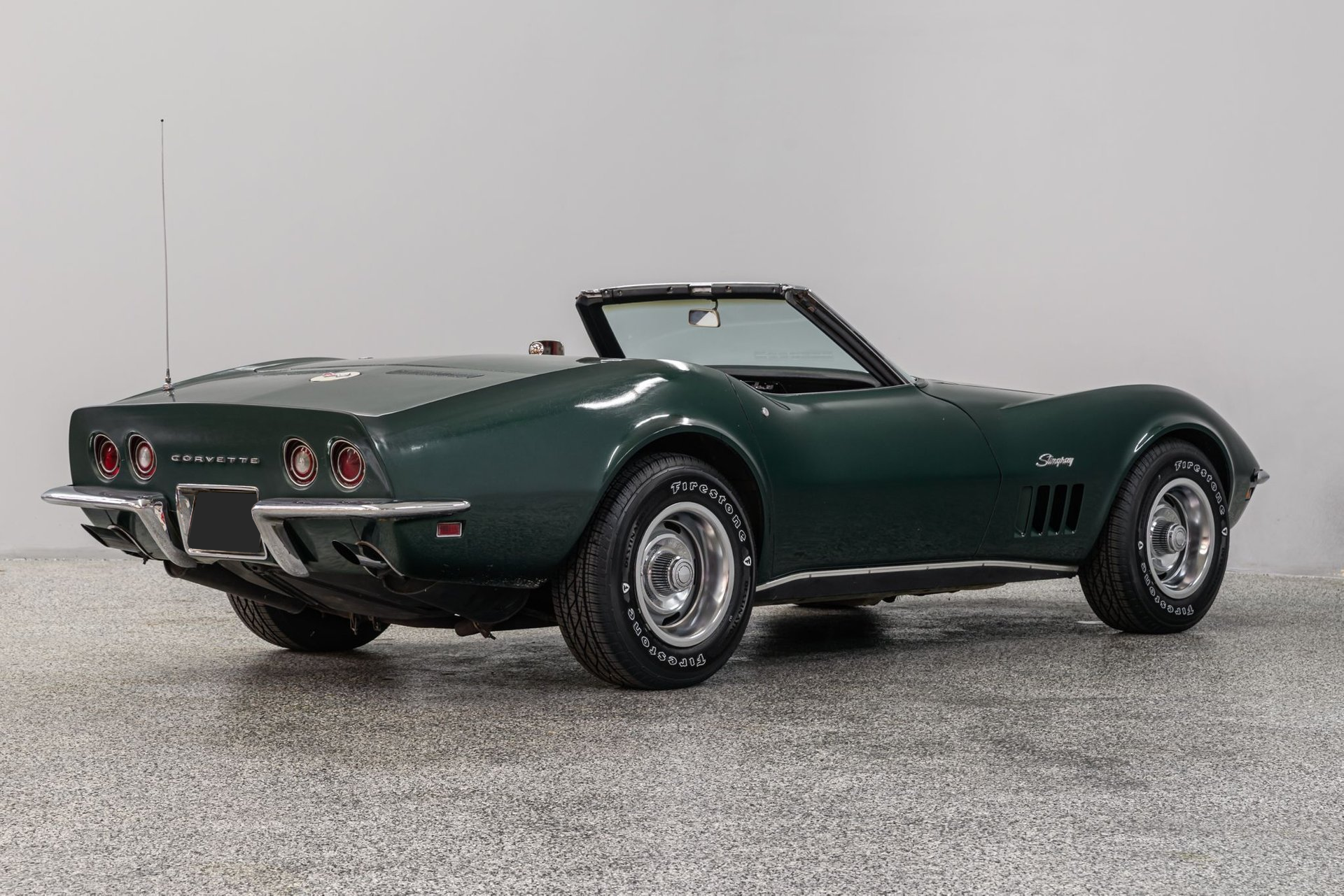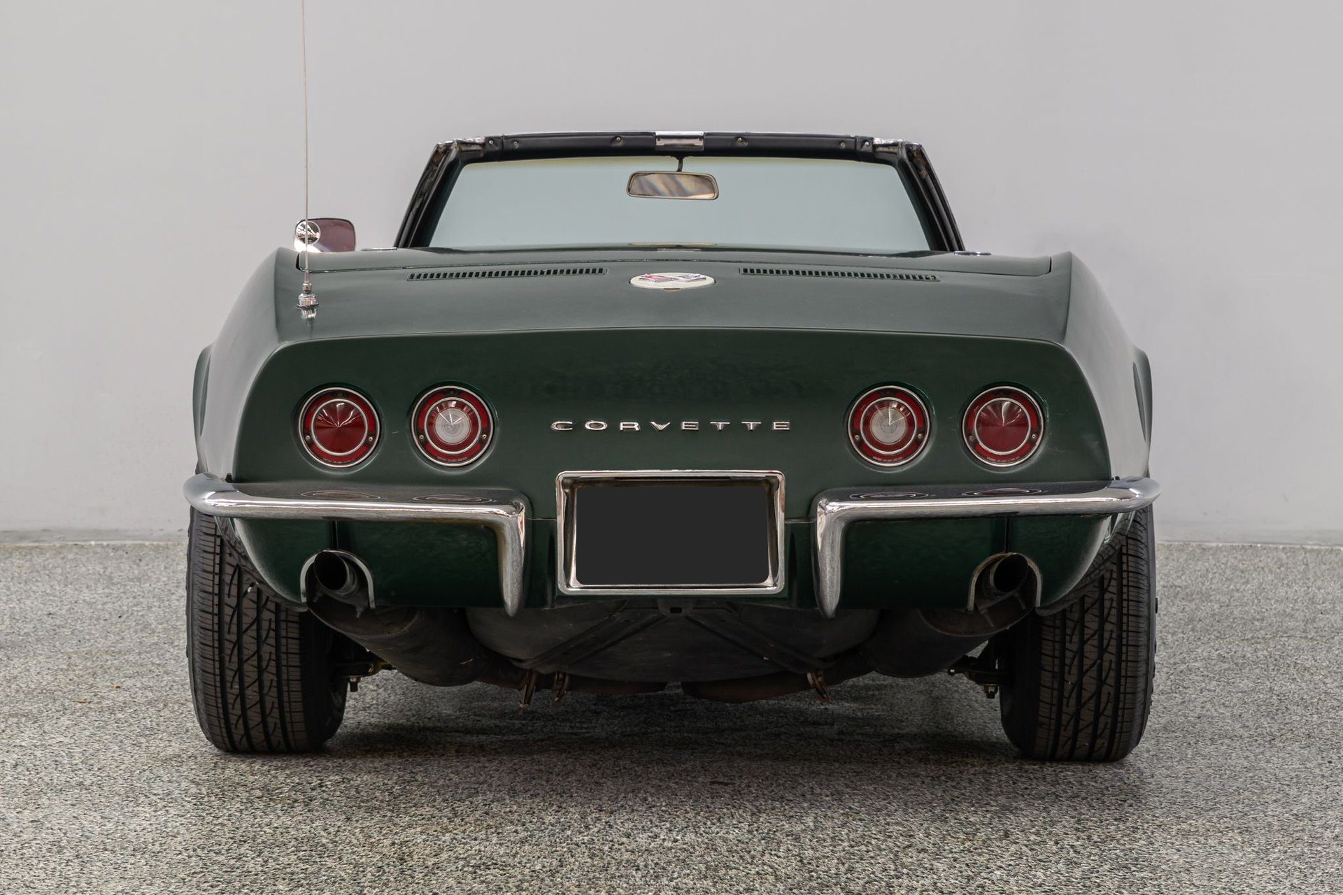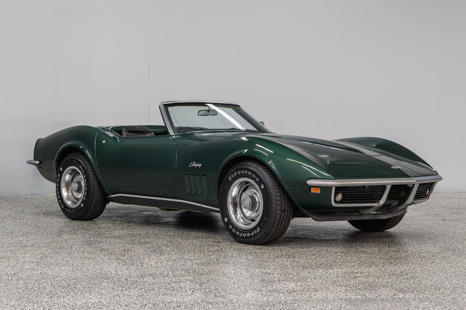 This 3-owner 1969 Corvette 'Stingray' roadster is said to be matching numbers through out. Except for a repaint 30+ years ago and some engine/suspension upgrades, it is original. It is not a show car, but a very solid driver. The owner believes that the roadster has never been in a fight - all of the gaps are true and all of the body components appear to be original. The frame and birdcage are excellent. The current owner, a senior, has had this car for over 25 years (garaged). The single-stage Fathom Green repaint (1988) is starting to show dulling on hood and trunk. The black leather interior is in good condition - dash and door cards are very good, all gauges (excp. clock) work including the mechanical tach and the factory AM/FM radio still plays. Headlight/wiper vacuum features work fine using the manual pulls. The canvas top is 'original 1969' and needs replaced, as do the rubber seals. The folding top frame is fine and rust-free. Under the hood, the owner states is the factory 350 /300hp that has been massaged, but runs fine on unleaded 93 octane. It was professionally built some 20,000 miles ago - bored .030 over, 10:1 pistons, 3-angle valve grind w/hardened valve seats, Schneider hydraulic flat tappet cam (350/350hp specs), Edelbrock Performer dual plane intake, 600CFM Holley and Hedman tube headers. (Included in the sale are original engine components including the intake manifold, Rochester QuadraJet carb and rams-horn exhaust manifolds.) The distributor is the factory points/condenser unit w/gear-drive tach. This is a nice, old-school small-block that is right. The motor is backed by the factory 4-speed wide-ratio trans w/Muncie shifter and stock 3.23:1 posi-traction differential. Clutch is very smooth and all u-joints have been replaced. The transmission and differential have been serviced, but have not required any repairs other than a trans rear seal a few years back. The Corvette has power steering and manual disc brakes. All brake calipers are stainless sleeved with new hoses/master cylinder and the suspension/sway bars have polyurethane bushings. Independent rear suspension has been upgraded with a new transverse steel leaf spring, new sway bar and camber-adjustable tie rods. New 225x70x15 Firestone Destination LE3 radials (very similar in appearance to the original F70x15 Firestone Wide-Ovals) are mounted on factory 15”x 8” GM Rally wheels with GM centers and after-market trim rings. You can buy a much newer 'Vette for the same money. It will however be worth less next year unlike this '69 4-speed Stingray roadster. If you are looking for a trailer queen, look elsewhere. If you want a classic C3 roadster that runs, come take a look - you will not be disappointed.